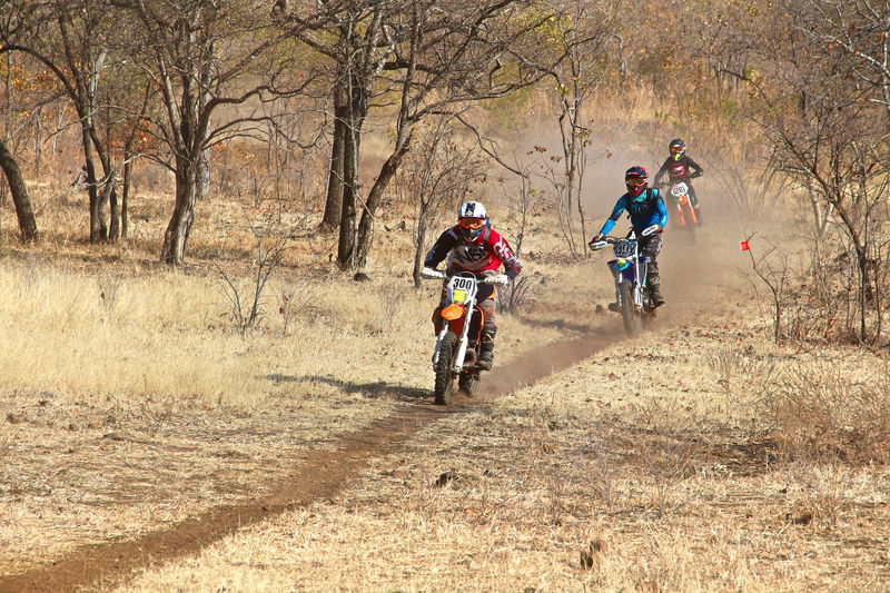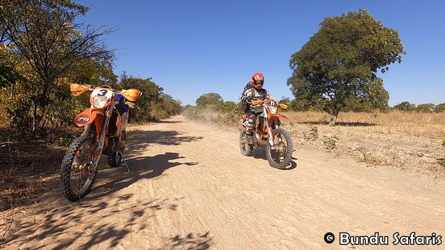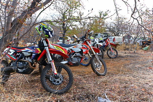 In the early afternoon, we set off on our off‑road enduro bikes, riding 50 kilometers through the bush until we reach the campsite at Mabula Farm.
